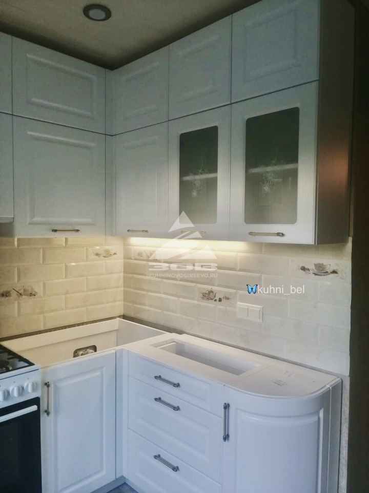 от 22 000 р. за м.п. Заказ УТ214. В небольшую кухоньку вместили все по максимуму, верх кухни с антресолями до потолка, напротив, буфет для красивой посуды, перетекающий в верхние шкафчики. Стиль кухни Неоклассика, который создали фасады из мдф-пвх Лонгфорд - это отличный, очень прочный и недорогой материал. Столешница из акрилового камня. Золотые накладные ручки добавляют элегантности. Фурнитура Hettich.Добавить в избранное