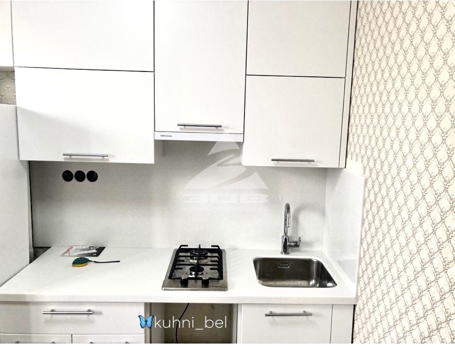 от 30 000 р. за м.п. Заказ УТ231. Кухня малышка получилась уютной, благодаря Матовым фасадами из Эмали, Каменная столешница и фартук, Металлическая мойка подстольного монтажа, Удобный подъёмный механизм на сушку Авентос блюм, Варочная на 2 конфорки, Вытяжка встройка.Добавить в избранное
