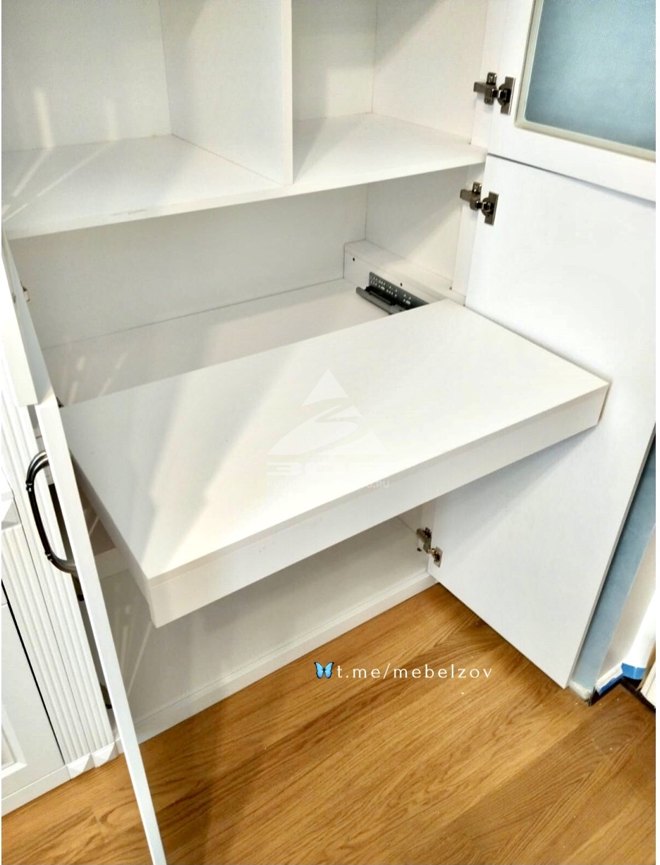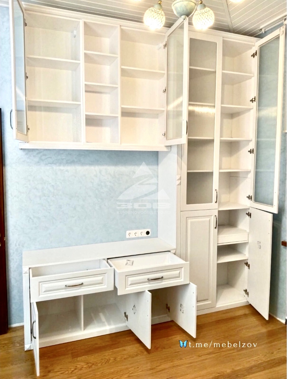МГС120. Шкаф в библиотеку, создан: Белые фасады с фрезеровкой, мдф-пвх, Белый корпус лдсп Еггер Выдвижной столик для принтера, Витрины со стеклом